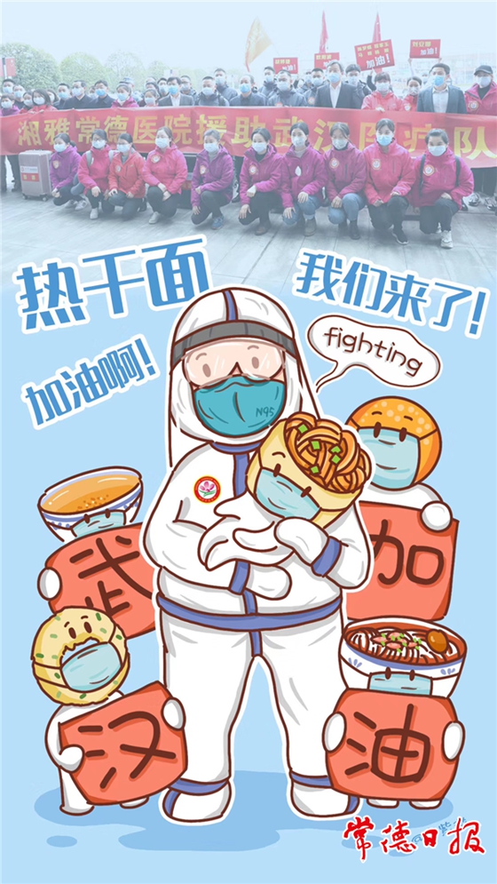 李紫微是湘雅常德医院事业发展部一名宣传干事,大学主修视觉传达专业,有手绘基础。21日,湘雅常德医院35名医护人员组成的我市第三批医疗队,驰援武汉。“作为医院一名行政人员,我见证了他们从请战到出征的全部过程,深受感动,我也想用自己最擅长的手绘为医护人员、为武汉加油打气。”李紫微说,此前,一幅“全国美食为热干面加油”的漫画在网络上走红,治愈的画风让她感到异常温暖。由此,一幅“常德医护人员和本地美食为热干面加油”的漫画作品开始在她的脑海中构思。
