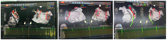 完善术前准备后,彭道地副教授、范爱德主任医师携手手术团队在中南大学湘雅医院教授指导下,通过精准房间隔穿刺,精细标测左心房三维模型,依据立体建模图形给予患者两侧肺静脉开口环形消融,隔离肺静脉开口电位,从小功率消融逐渐加大功率,最终消融成功。手术治疗过程顺利,没有出现并发症,术后复查心电图示窦性心律正常。
