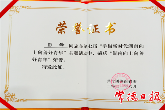 6月11日,2021年度“新时代湖南向上向善好青年”名单出炉,湘雅常德医院门诊部副主任彭锋获此殊荣。