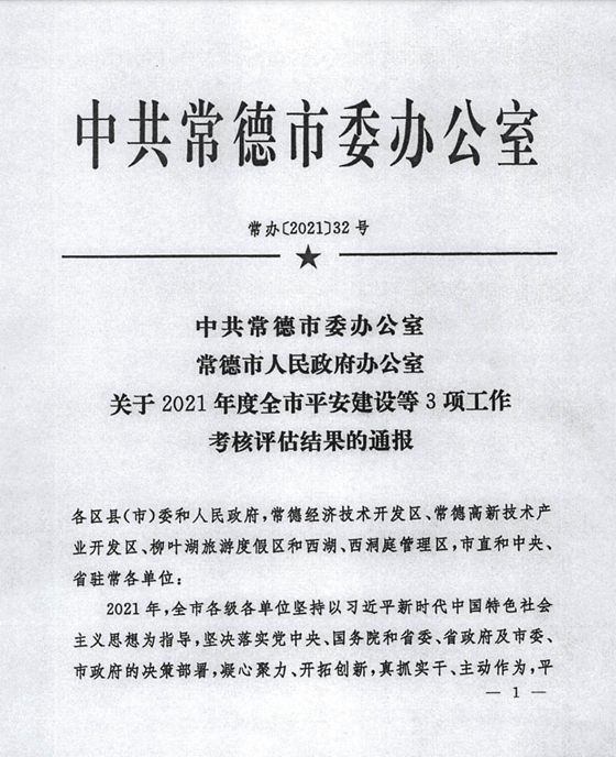 2021年12月27日,考评工作结束,中共常德市委办公室、常德市人民政府办公室联合对考评结果进行了通报,我院喜获常德市“平安医院”荣誉称号。