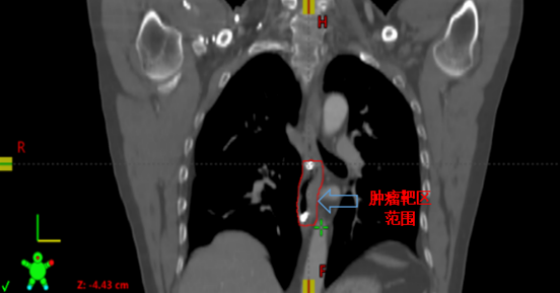 接诊后,肿瘤科钟美佐主任同李军烽副主任医师结合患者既往病史和实际情况决定对病变部位实施放射治疗。考虑到患者食管病变较早,CT无法清晰显示病变部位及范围,患者曾经又接受过上段食管放射治疗,为进一步减少照射范围,准确定位肿瘤位置,肿瘤科联合消化内科,通过消化内镜在原位癌处附近植入金属钛夹标记物后再行增强CT,根据钛夹位置对病灶实施精准定位,尽可能的减少不必要的照射,降低患者放疗副作用的发生。目前高大哥已结束放射治疗,不适症状得到明显缓解。
