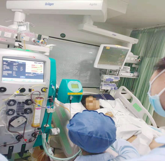 李晓林教授为患者体查后,第一时间优化治疗方案,指示给予患者大剂量激素及丙种球蛋白冲击等治疗。考虑患者输血存在极大溶血风险,曹星辉副主任医师紧急联系输血科专家会诊并根据患者情况作出了暂备血不输血、必要时联合血浆置换等决定,嘱密切监测患者生命体征及血常规等指标。不到3天时间,患者病情发展迅猛,白细胞升高至237.9×109/L,血红蛋白跌至21g/L,6月28日清晨,患者出现嗜睡、呼之不应及血压下降等休克表现,告知家属患者随时存在生命危险,家属表示充分理解信任并嘱咐医护人员尽全力救治。