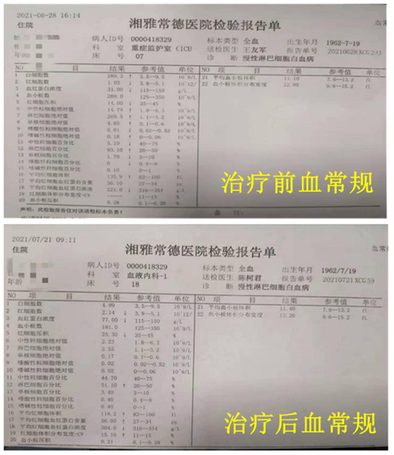 近日,湘雅常德医院血液科联合多学科成功救治一例罕见超高白细胞合并极重度溶血性贫血慢淋患者。目前,患者顺利完成化疗免疫治疗,病情转危为安,现已康复出院。