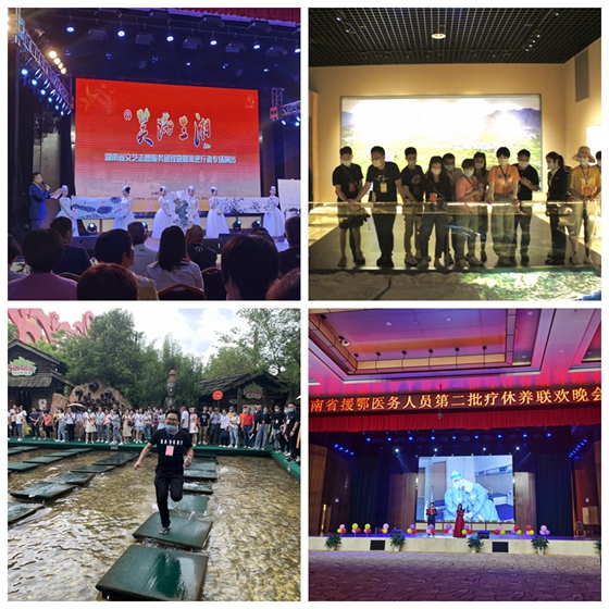 为期五天的行程,医护人员们领略了青铜博物馆、冰雪王国、泰国风情馆的古文化魅力,也见识了《炭河千古情》以及笑满三湘送文艺下基层里的精彩表演。湖南省文艺志愿者协会还组织了湖南省书画名家向包括我院在内的8家医疗单位捐赠了自己的书画作品,表达了文艺工作者对医护人员的崇高敬意。最后,疗养活动以抗疫英雄们自创的娱乐节目进入尾声,大家在欢声笑语中为湖南省总工会送来的贴心安排画上了完美句点。