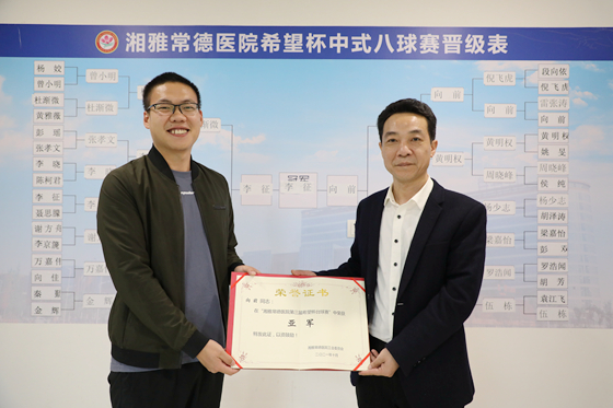 为丰富员工业余文化生活,全面推进单位健身活动的开展,近日,湘雅常德医院举办的第三届“希望杯”台球赛在行政楼809活动室落下帷幕。