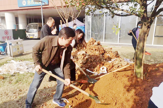 活动当天,参加植树的医务人员手持铁锹,干劲十足,挖坑、种树、填土、浇水……经过一番辛苦劳作,分别在急诊大楼前和一号住院楼前种下了不少香樟树。
