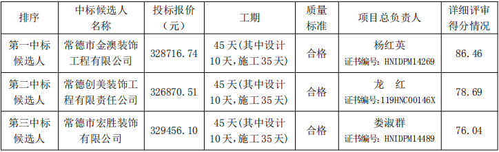 评标委员会按照招标文件确定的评标办法,对所有有效投标文件进行了详细的评阅,评委们经过集体评议和自主计分,推荐的中标候选人如下: