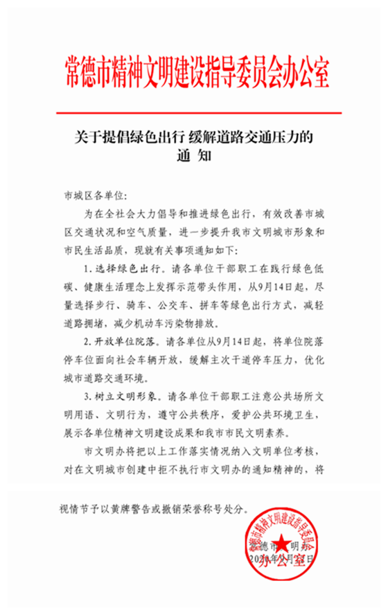 为进一步改善城区交通状况及空气质量,优化市区环境、提升生活品质,改善医院环境面貌,提升整体服务水平,并传达常德市精神文明建设指导委员办公室的《关于倡导绿色出行、缓解道路交通压力的通知》文件精神,湘雅常德医院以“绿色出行、低碳生活”为主题,向广大职工发起倡议: