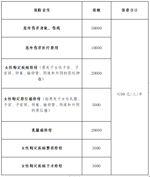 | 意外伤害身故、伤残 | 50000 | ≤99元/人/年 |