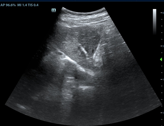 手术在胡康新教授的指导下进行,由汤金城医师、黄彬副主任医师共同为患者实施了微波消融术。患者局部麻醉后,在B超定位下准确刺中左肝病灶,动态消融7分钟,退出消融针后再次B超探查发现左肝另一低回声信号结节,故再次进行动态监测下消融4分钟。术中患者并无明显不适,术后安全返回病房。