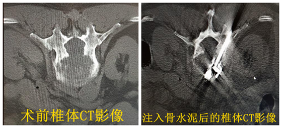 为患者制定切实可行的治疗方案后,4月6日,在放射介入科主任胡康新的带领下,决定为患者实行CT引导下椎体转移癌消融术+椎体成形术。手术由胡康新主任主刀,汤金城副主任医师和黄彬副主任医师协助,首先让患者俯卧在CT检查床上,经CT定位后,进行局部麻醉,在CT监视下将穿刺针穿刺到目标椎体处,位置满意后,拔除针芯,随后经套管置入微波消融针,消融3分钟后,再置入椎体球囊撑开器,注入显影剂撑开目标椎体,位置满意后将调和好的骨水泥缓慢注入椎体内,待CT扫描见骨水泥弥散满意并无明显外溢时,等待骨水泥凝固后拔除穿刺管道。术中患者并无明显不适,术后安然返回病房。