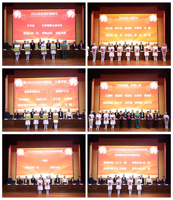 主管副院长兼工会主席汤爱国宣读了在2022年“优秀护理单元、优秀护士长及十佳护士”、“30年护龄”、第七批次三星评选、2022年护理安全警示案例竞赛、常德职业技术学院2022学年度教学单位优秀带教老师评选5项护理活动中评选的获奖集体和个人名单。他感谢全院护理人员长期以来的辛勤工作与默默付出;同时也代表全体护理同仁感谢各级领导对护理工作的支持、关心与关爱,他期待护理团队能再接再厉,在等级医院评审中再创佳绩。