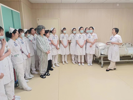 此次培训活动在在内分泌代谢科病区举行,由护士长付小爱组织策划,演练脚本的病例情景设置为胰岛素治疗患者,睡前如厕突发低血糖跌倒,病例选择贴近专科实际。应急演练团队由晚班值班医生彭彩、晚班护士徐戊环和欧阳佳、跌倒患者徐奶奶(护士鲁莉扮演)共4人组成。培训流程为:内分泌科医护团队示范演练→团队成员着重介绍各自职责定位与团队配合要点→现场答疑→观摩科室现场练习及导师指导。示范演练从晚班护士发现患者跌倒、呼救、评估意识、测量血糖及生命体征、快速建立静脉通道,到值班医生的现场评估、判断、紧急处置以及患者搬运至病床、进一步伤情确认、协助外出检查、正确处理受伤部位、病情解释与患者安抚、不良事件上报等多个环节和细节进行了全方位展示,全面、真实地还原了跌倒患者处理的全过程。全院各临床科室医护团队(1名医生和2名护士)分4批次进行了现场观摩和练习。
