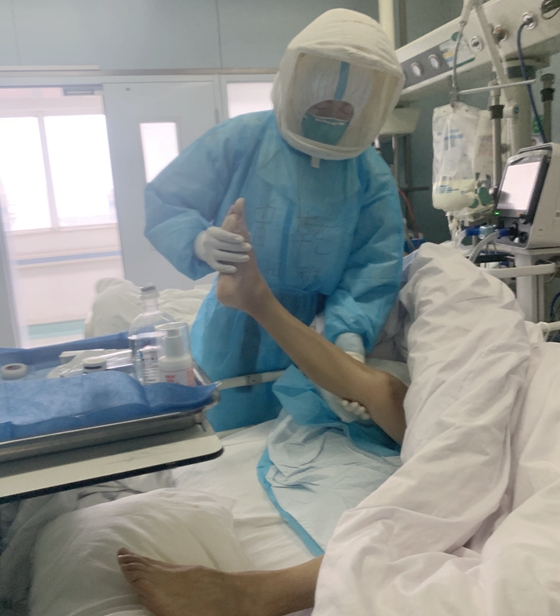 曾乾为重症患者做腿部康复