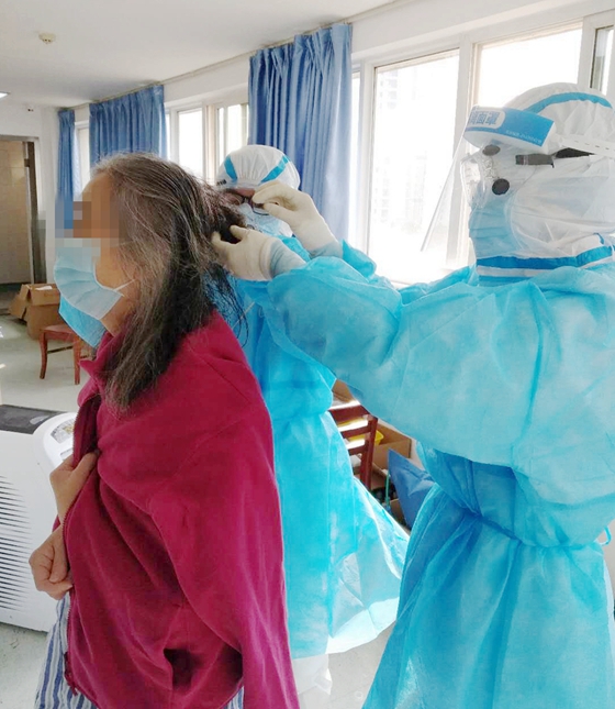 万李(右)帮患者马阿姨修剪头发