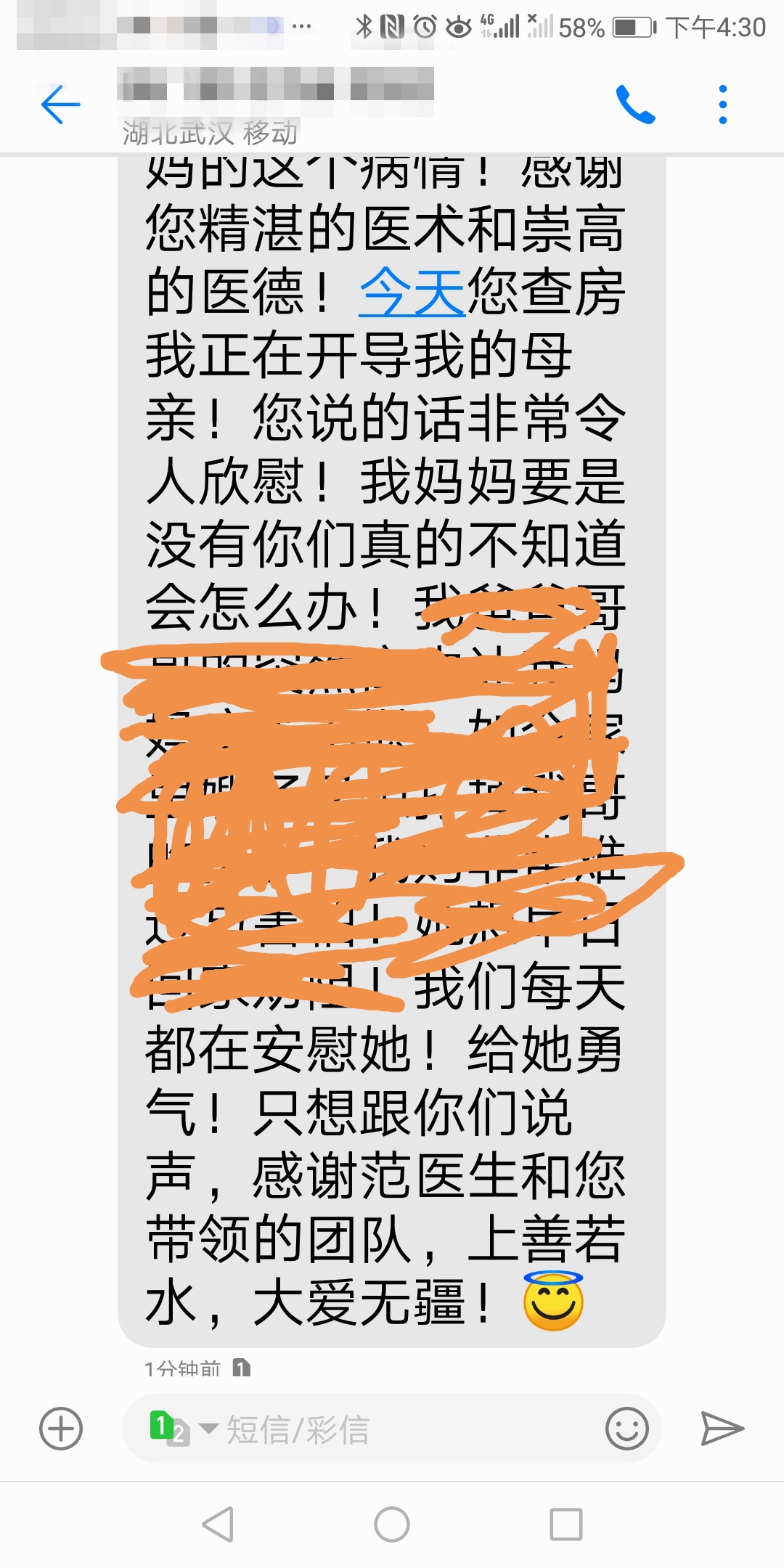 3月19日,范爱德的手机里弹出一条短信:“感谢您精湛的医术和崇高的医德,今天您来查房时,又在开导我的母亲,您的话语令人欣慰。感谢范医生和您带领的团队,上善若水,大爱无疆!”范爱德回忆了下,原来是半个月前照顾的那位老人的女儿,是她发来的短信。
