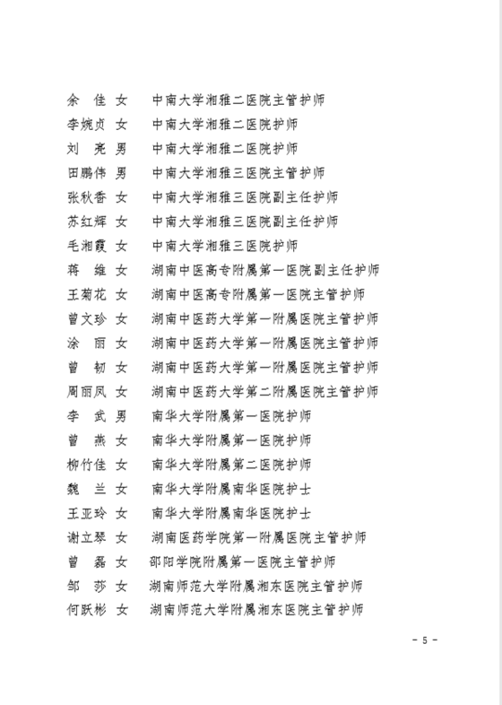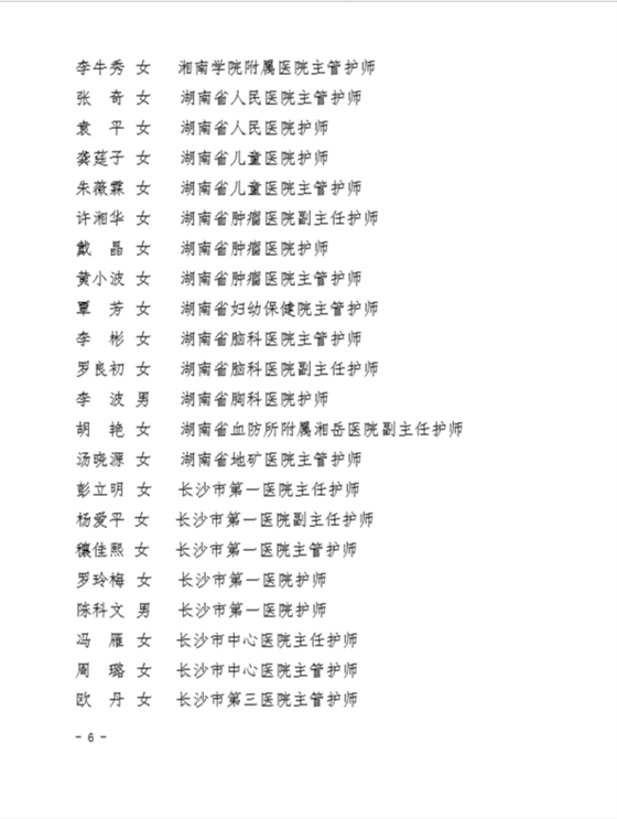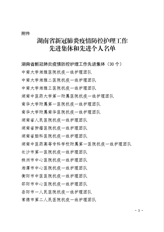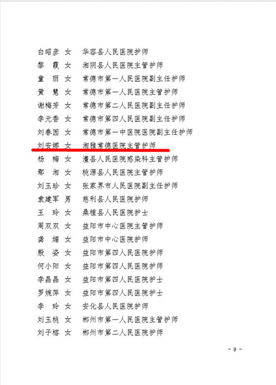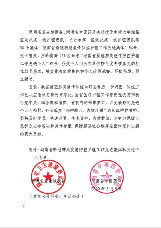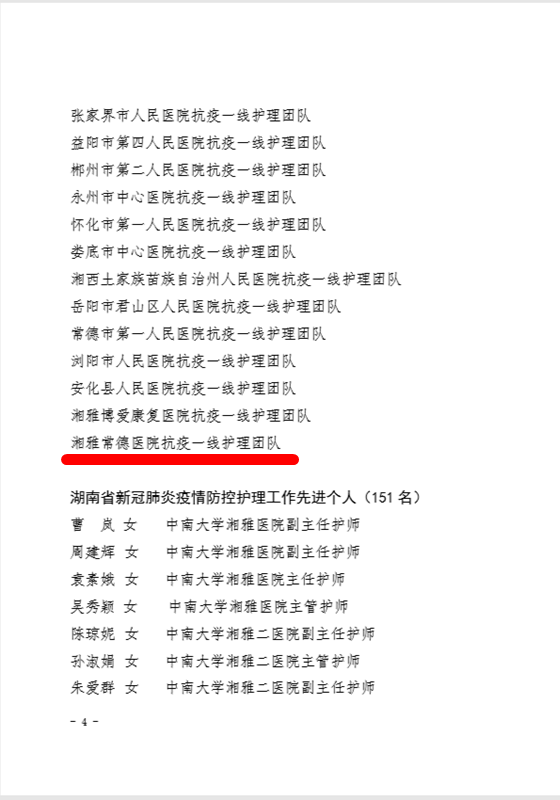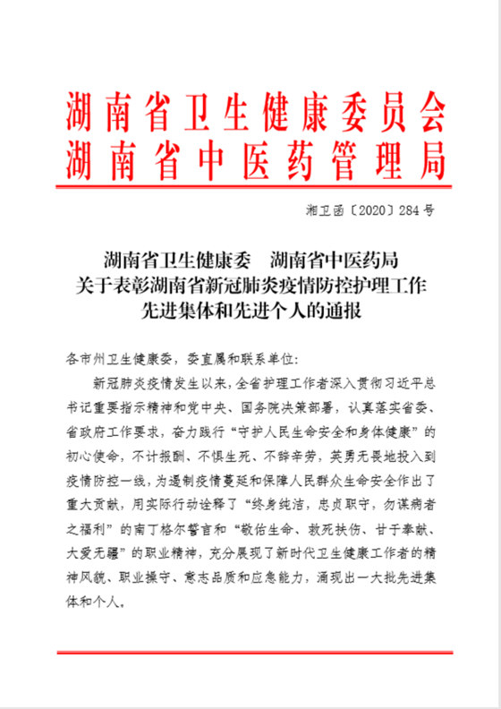 5月12日,在第109个国际护士节到来之际,湖南省卫生健康委、湖南省中医药局联合下文《关于表彰湖南省新冠肺炎疫情防控护理工作先进集体和先进个人的通报》,表彰一批不计报酬、不惧生死、不辞辛劳,英勇无畏地投入到疫情防控一线、为遏制疫情蔓延和保障人民群众生命安全作出了重大贡献的白衣天使。湘雅常德医院抗疫一线护理团队荣获“湖南省新冠肺炎疫情防控护理工作先进集体”称号,刘安娜护士长荣获“湖南省新冠肺炎疫情防控护理工作先进个人”称号。