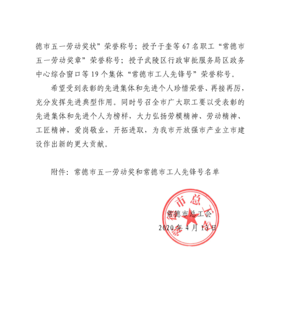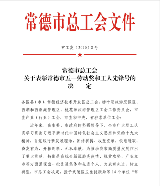 近日,常德市总工会发文表彰一批自觉践行新发展理念,团结拼搏、攻坚克难,锐意进取、奋发有为,开拓创新、无私奉献,为推动我市高质量发展作出了重大贡献,特别是在抗击新冠肺炎疫情、脱贫攻坚、产业立市等方面涌现出一批先进集体和先进个人。湘雅常德医院范爱德、刘安娜、施霞丽荣获“常德市五一劳动奖章”荣誉称号。