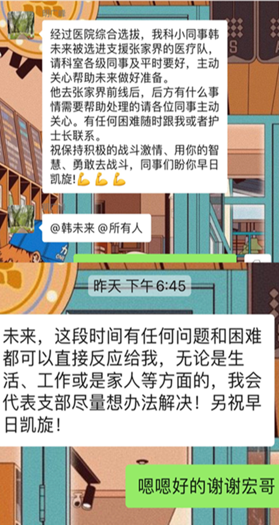 “滴滴滴……”,一阵急促的手机铃声扰乱了正在上班的我,“请问是韩老师吗?接市卫健委通知,今天下午六点驰援张家界,您有时间吗?”接到电话后,我毫不犹豫的回答道:“有时间!”