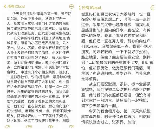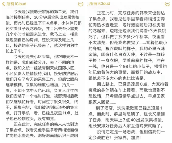 让我印象深刻的两件事:第一天在鑫成君泰小区,有一个老爷爷被家里人推着轮椅来采核酸,看着像是中风偏瘫患者,牙关紧闭就是不张嘴,家人在一旁耐心的教他怎么配合我们,当时雨越下越大,后面淋雨排队的居民没有一个人催促,几分钟之后爷爷终于张嘴,顺利配合我采完了标本。还有一次,在名流园社区,当时应该是晚上9点了,有一个老爷爷拄着拐杖颤颤巍巍的走到我面前,把身份证递到我面前,告诉我他的名字,并说这是他第八次采核酸了,我点头后他张大嘴巴发出“啊……”的长音,整个采集过程只有几秒钟,我不知道他是走了多远过来的,也不知道他排了多久的队…但是从他们身上看到的是张家界人民为这次抗疫所付出的努力,也是这种精神让我一直坚持到采完当晚最后一个标本。