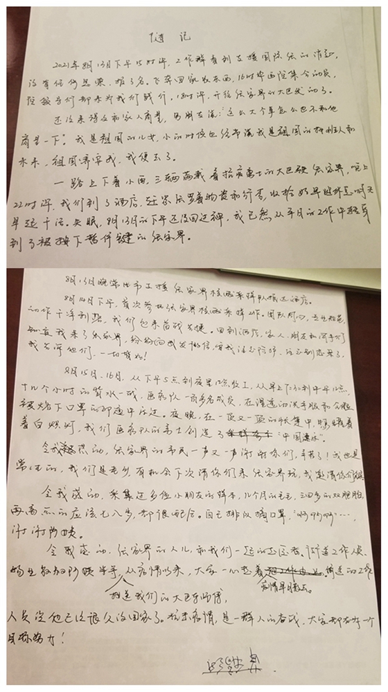 8月13日下午四点医院通知支援张家界采核酸队伍需要即刻出发,我义无反顾地踏上了支援张家界的道路,并选择了对你们隐瞒。一直到在张家界的第二天,和你们的视频通话,看出了我不在常德,请原谅我没有第一时间告知你们。闲暇时的通话,你们总是哽咽地叮嘱我,一定要注意安全啊,在酒店也一直反复叮嘱我戴好口罩,戴好口罩,我说我吃饭呢,怎么戴口罩。同时,我也是充满了自责,自古忠孝难两全,因为工作不在家乡,长时间不在你们身边,我照顾了那么多病人,却照顾不了我自己的父母。前段时间爸爸生病住院手术,我也只是抽出了几天时间去医院照看,看着你们自己从办理住院到办理出院忙前忙后,我却只是在手术同意书上签个字,你们从未责怪过我。所以感谢我那平凡又伟大的父母,从来只担心你们的女儿过得好不好。谢谢你们的理解,因为我们都知道,只有祖国越来越繁荣昌盛,我们老百姓才会越来越好。所以当国家需要我这个小士兵的时候,我必须去,只有前方的疫情控制了,后方的大家才能安全。在我们的国家,疫苗免费打,核酸免费做,这在别的国家是遥不可及的,我们生在红旗下,长在春风里,目光所致皆为华夏,五星闪耀皆为信仰。谢谢爸爸妈妈的支持,现在的我变得很勇敢,因为我的身后有你们,有我的医院,有我们的国家!