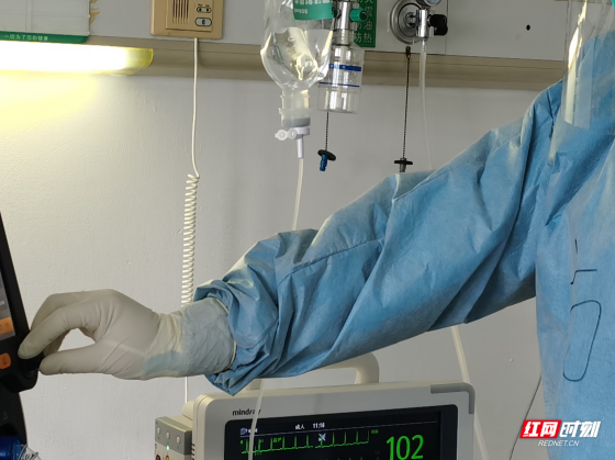 2020年3月,方磊在武汉市金银潭医院危重症隔离病房调节呼吸机参数