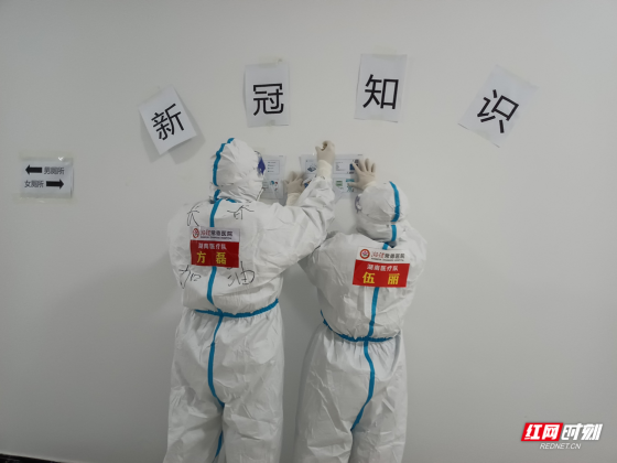 有了这个想法后,方磊在下班休息期间,通过上网查找各种资料,完成PPT的制作。由于没有投影设备,方磊决定将PPT文稿打印出来带进方舱病区。4月20日,方磊和队友们先是在病区走廊的空白墙上一起布置了新冠知识宣传栏,随后又去给患者进行新冠知识的专题宣教。为了避免患者聚集,宣讲分区进行。由于没有扩音设备,又隔着防护服,只能尽量提高音量……几场宣讲下来,方磊已是汗流浃背。