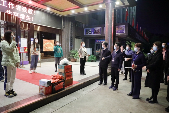 11月25日,湘雅常德医院党委副书记、院长肖目张,党委副书记周晓峰,副院长沙新平带领院工会及相关职能部门负责人一行来到抗疫一线人员下榻的酒店,看望慰问参与此次疫情防控工作的一线人员。