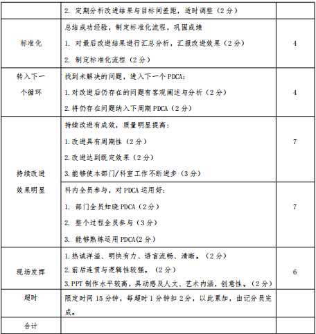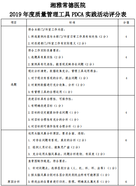 评分标准包括选题、原因分析、对策拟定、实践力、活动成效、现场发挥等方面。评分标准参照湘雅常德医院2019年度质量管理工具PDCA实践活动评分表(见附件1)。