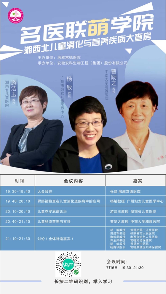 当前,儿童胃肠道动力疾病、儿童营养不均衡等问题日益突出,越来越受到家长和全社会的关注。为了更好的关注儿童肠胃健康问题,湘雅常德医院将举办“名医联‘萌’学院——湘西北儿童消化与营养疾病专题讲座”,并于7月6日晚19:30采用线上直播方式进行,届时可通过扫描二维码关注并参与学习。