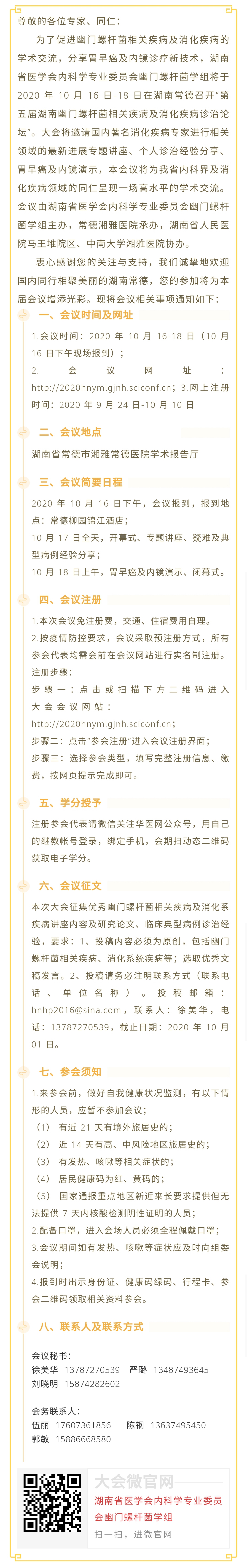 湖南省医学会内科学专业委员会幽门螺杆菌学组第五届幽门螺杆菌相关疾病及消化疾病诊治论坛会议通知(第一轮)