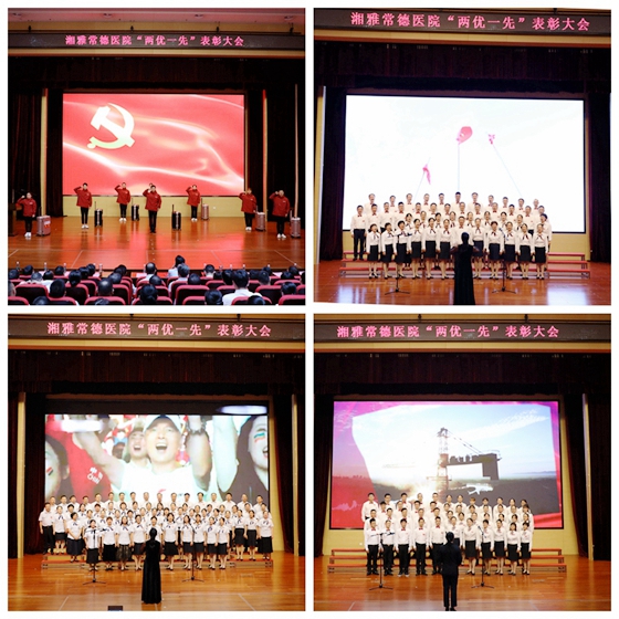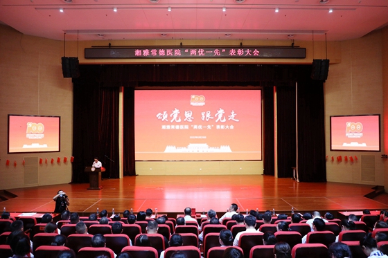 在中国共产党百年华诞即将到来之际,6月29日晚,湘雅常德医院隆重召开“两优一先”表彰大会,重温党的光辉历程、聆听先进典型事迹,为“光荣在党50年”党员颁发纪念章,为获得医院“两优一先”表彰奖励的党员及党组织颁发证书和奖牌。大会由医院党委副书记、院长肖目张主持,全体院领导、各行政及业务科室主任、护士长、各党支部非值班党员、入党积极分子、全体行政人员等400余人参会。