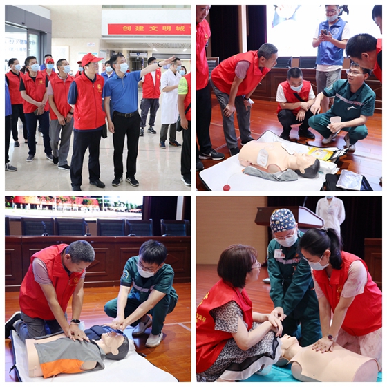 首先,医院志愿者为来访人员介绍了医院的基本情况。随后,为进一步提升大家的安全防范意识,全体人员来到学术报告厅,参加“普及急救知识,守护生命安全 ”培训活动。急诊科彭珊红副主任医师向大家全面讲解了心肺复苏、AED(自动体外除颤仪)、气道异物梗阻(海姆立克急救法)、溺水等急救知识。急诊科肖浪护师、黎玭护师利用人体模型演示了心肺复苏、气道异物梗阻的急救方法,并邀请大家进行现场实际操作,从确认环境安全、判断患者意识、按压部位、按压手势等多个步骤进行了规范的指导与培训。