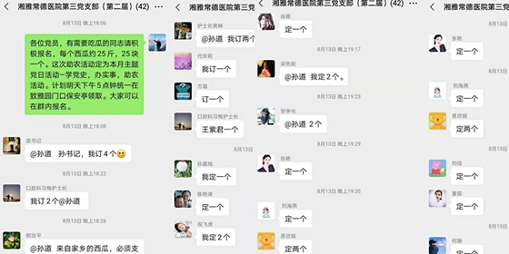 8月13日,湘雅常德医院第三党支部联系到了视频里的瓜农,了解实际情况,同时在线上发起爱心助农活动,支部党员争相认购。仅仅4小时,第三党支部已认购沙漠瓜1300斤。党支部书记孙道有序安排了助农活动,支部党员在分批次少接触的情况下取回了香甜的西瓜。