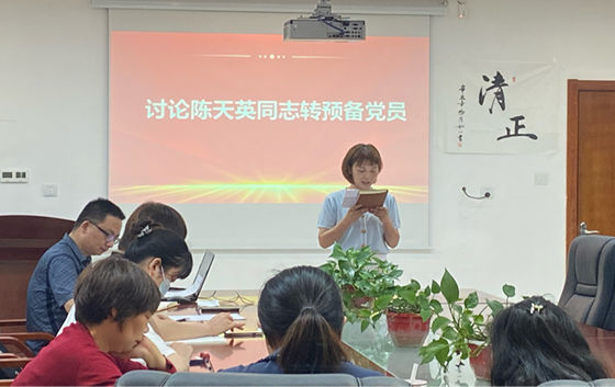 会议就吸收陈天英为预备党员展开讨论,大会首先充分了解发展对象陈天英同志对党的认识、入党动机、履历等情况,听取了陈天英同志向党组织汇报的问题。会议严格按照流程进行讨论投票,全体党员一致同意吸收陈天英同志为中共预备党员。欧阳波同志表示,希望陈天英同志向身边的优秀党员同