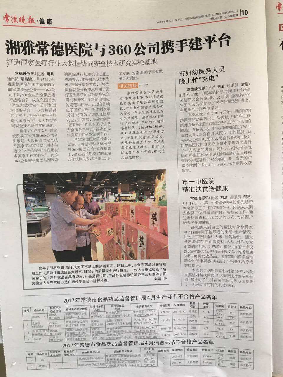 5月24日,湘雅常德医院与国内领先的互联网络安全企业——360公司下属360企业安全集团就“医院大数据安全分析和运营创新平台”在湖南常德柳园锦江酒店举行战略合作签约仪式。常德市发改委主任刘凡荣,常德市经投集团董事长何克明,湘雅常德医院院长李远斌,360企业安全集团副总裁何新飞,北京天健源达科技有限公司总经理周洋,用友医疗卫生信息系统有限公司副总裁张营等出席签字仪式。