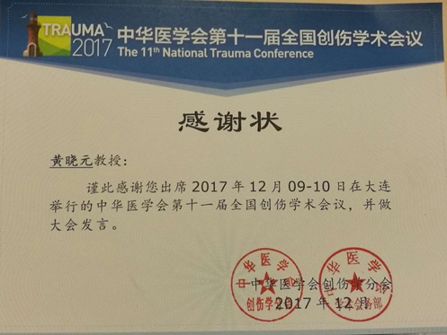 12月8日,由中华医学会、中华医学会创伤学分会主办的“第十一届全国创伤学术会议”在大连召开,湘雅常德医院整形美容科主任黄晓元教授当选为中华创伤外科学会感染学组副组长,由王正国院士颁发荣誉证书。