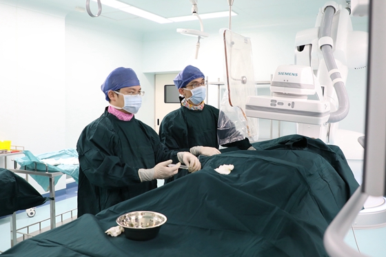1月2日,在放射介入中心主任胡康新教授的指导下,汤金成和李毅副主任医师为患者实施了手术。手术在DSA机引导下进行,首先行经皮穿刺肝胆管造影术,医师手法熟练、精确判断,很快便找到肝胆管梗阻部位,并对梗阻胆管进行了疏通并安放了一个支架,解除了患者的胆道梗阻并建立了内引流通道;随后在支架内胆管癌部位植入碘125放射性粒子,对肿瘤进行近距离放射治疗;最后,还放置了一个胆道外引流管进行外引流。手术在局麻下进行,全程仅一个小时,术中患者几乎无痛苦,完全达到手术预期目的,术后患者及其家属均表示十分满意。