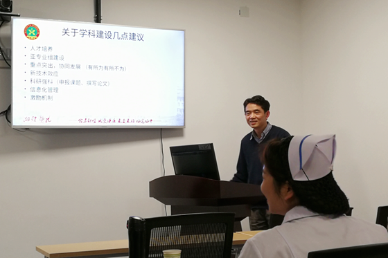 同时,肖湘成教授在会上就湘雅常德医院肾内科今后的学科建设提出了几点建议:第一,人才培养:一个科室的发展,离不开人才,所以学科建设的重点是人才的培养;第二,亚专业组的建设:为了科室的全面发展,以及调动全科医护人员学习工作的积极性及主动性,科室可成立亚专业组,如血管通路组、CRRT组等,根据自己的兴趣及能力,每一名医护人员可选择加入一个或多个亚组来不断提升自己,促进科室进一步向前发展;第三,湘雅常德医院肾内科的建设需重点突出,协同发展,每一阶段制定及完成一个任务和目标,切忌操之过急;第四,积极开展新技术,目前湘雅常德医院肾内科已开展CRRT技术,在此基础上,可进一步发展血浆置换、血液灌流、血液滤过,甚至免疫吸附等技术,吸引更多患者前来就诊;第五,在积极发展提升临床技术的同时,不要忘记科研方面的工作,要积极申报课题,撰写论文。此外,还可以适当的激励机制,提高医护人员的积极性。