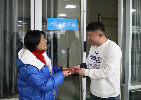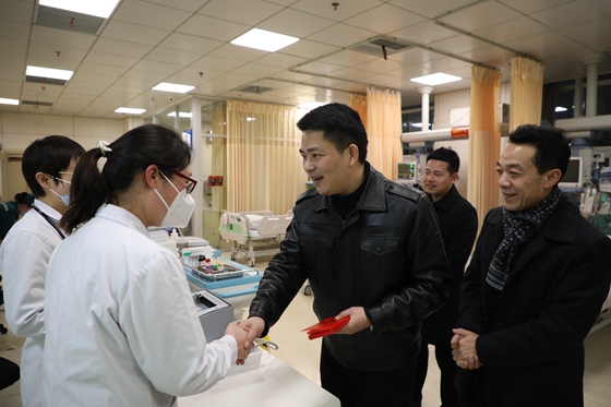 在各个工作岗位上,工作人员各司其职,工作井然有序。“大家辛苦了!” “过年好!”“给大家拜年了!” 慰问组一行每到一处,就与医护人员亲切握手、问候、交谈,并向坚守岗位的职工送去节日的祝福,对大家在过去的一年中对医院建设和发展做出的贡献表示了由衷的感谢。