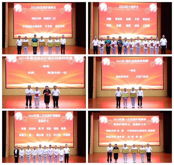护理部主任贺连香首先向坚守在平凡岗位上辛勤付出、无私奉献的全体护士表示节日的祝福和衷心的感谢,并对2024年度护理工作进行了简要总结:专科护理学术影响力不断提高,成功举办国家级继续教育培训班和科研专委会年会,新增多项学术任职,各类竞赛中屡获佳绩,取得了多项科研成果;开展分层级规范化培训,继续强化“三基三严”,持续推动新入职护士、专科护士、低年资/骨干护士院内轮科培训,提高护士岗位胜任力;首创护理指标看板,推进“标准化护理服务作业书”,成功通过卓越护理服务评审。未来,强化护士人才培养、优化护理服务内涵,推进国家护理质量数据平台上报数据的智能化提取与统计分析,申请省级省重点,助力医院等级医院评审,为医院的高质量发展和健康中国建设贡献我们护理团队应有的力量。