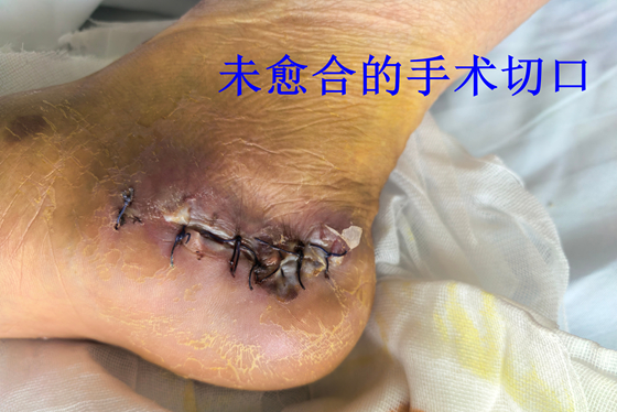 近日,饱受右足病痛折磨的杨女士来到湘雅常德医院骨科门诊就诊,她因在院外行银针治疗,导致右足跟骨骨髓炎,6个月以来辗转多家医院求医未果。由于病情复杂,最终她选择前往省城某医院就诊并予以手术治疗,本以为术后可以获得痊愈,却不料在术后第10天时发现手术伤口红肿,大量稀薄渗液流出,手术切口迁延不愈,右足病情再次回到原点,甚至比术前看起来更加糟糕。“我不会要截肢吧?”,焦虑与恐慌在杨女士的心头久久萦绕不散。