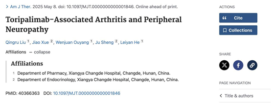 近日,湘雅常德医院在SCI期刊《American Journal of Therapeutics》(JCR Q2区,IF:2.9)上发表了题为《Toripalimab-associated arthritis and peripheral neuropathy》的研究论文。该研究...