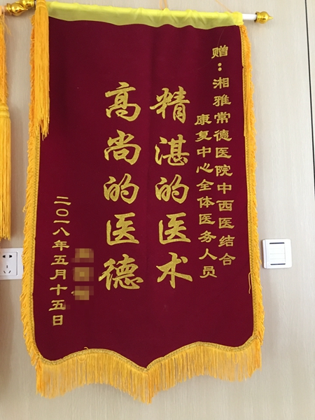 5月21日,病人周嗲嗲给中西医结合康复中心送来了一面锦旗,对中西医结合康复中心治好了他的头疼,表示衷心感谢! 是怎么回事呢?半个月前,由儿子陪着来到湘雅常德医院中西医结合康复中心看...