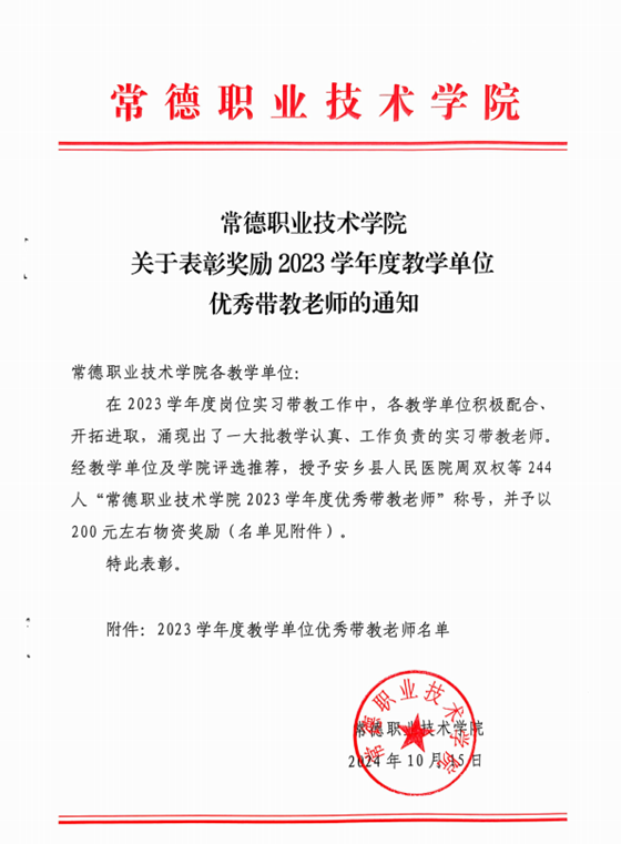 近日,经过医院与常德市职业技术学院的严格评审与推荐,我院的张梦婷、郭华、刘洁、蔡燕芝、蔡丽君以及赵子幸六位医技护理人员荣获“常德职业技术学院2023学年度优秀带教老师”称号。 &nb...
