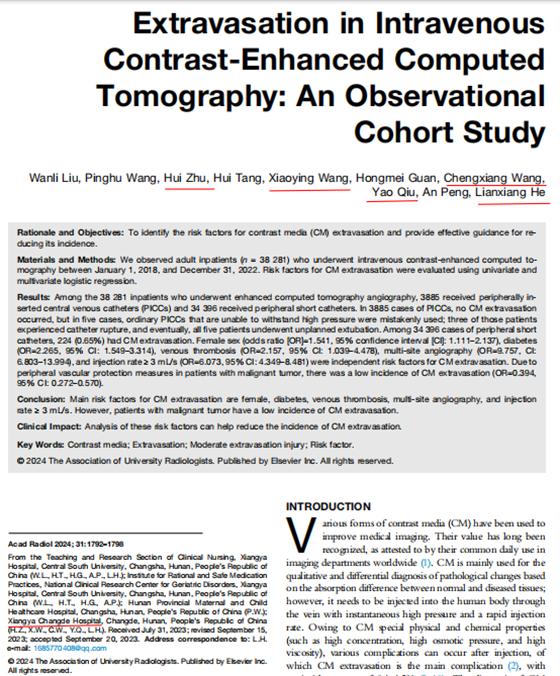 近日,湘雅常德医院护理部团队一篇研究论文在国际知名期刊《 Academic radiology》(JCR Q1区,IF:4.8)上发表论文,题目为《Risk Factors for Contrast Media Extravasation...