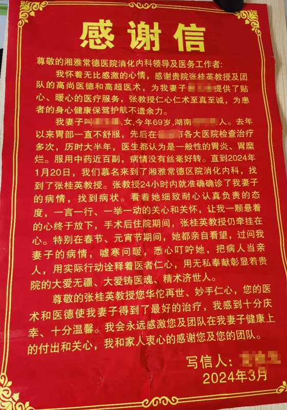 “尊敬的张桂英教授您华佗再世、妙手仁心,您的医术和医德使我妻子得到了最好的治疗,我和家人衷心的感谢您及您的团队。”近日,60多岁的龙先生特地从外地来湘雅常德医院为消化内科送来...