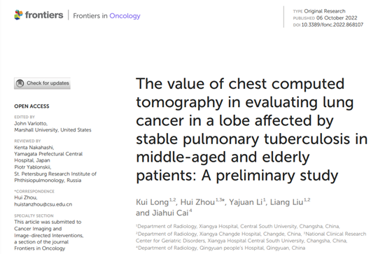 近日,湘雅常德医院放射科团队一篇研究性论文在国际知名期刊《Frontiers in Oncology》(JCR 2区,IF:5.7)上发表,论文题目《The value of chest computed tomography in evaluating lu...