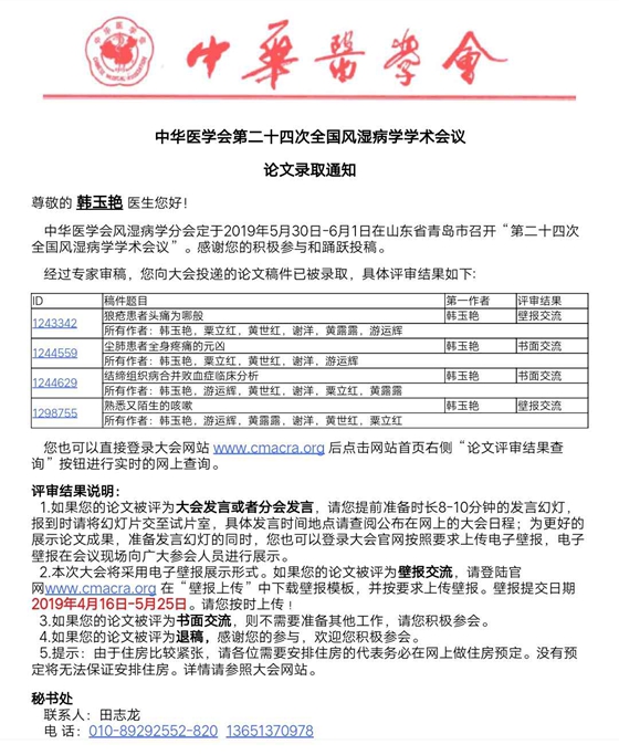 中华医学会风湿病学分会近期召开了“中华医学会第二十四次全国风湿病学学术会议”。湘雅常德医院风湿免疫科参与,踊跃投稿,经过专家审稿,韩玉艳主治医师投递的论...