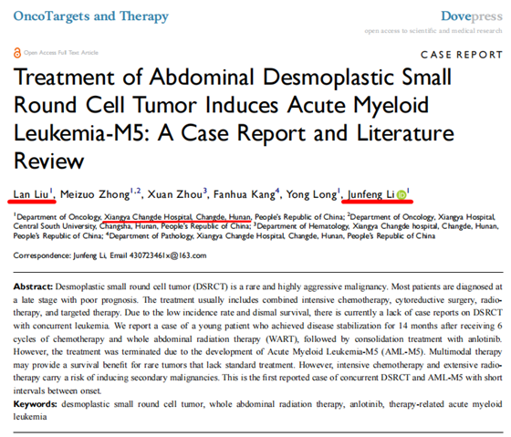 近日,湘雅常德医院肿瘤科团队在国际期刊《OncoTargets and Therapy》(JCR 2区,IF:3.3)上发表一篇研究论文,论文题目为《Treatment of Abdominal Desmoplastic Small Round Cel...